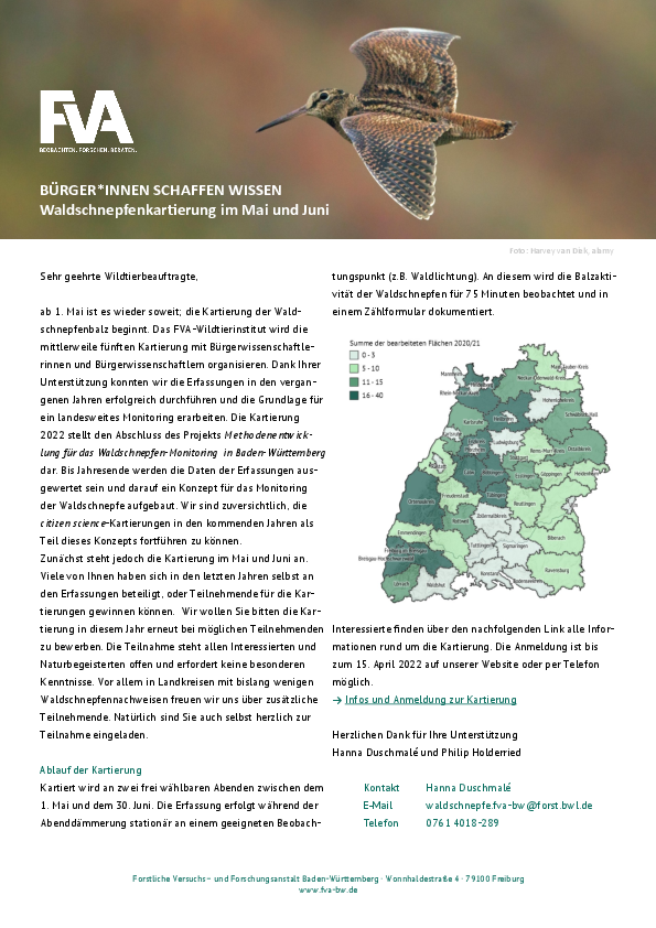 Das FVA-Wildtierinstitut organisiert zwischen 1. Mai und 30. Juni erneut  eine Kartierung der Waldschnepfe in Baden-Württemberg. Unterstützt von einer Vielzahl an Bürgerwissenschaftlerinnen und Bürgerwissenschaftler hat sich die Kartierung in den letzten Jahren zu einem echten Erfolg entwickelt. Ergänzt durch bioakustische Erfassungen wurden 2021 345 Standorten im ganzen Land auf das Vorkommen der Waldschnepfe untersucht. An die Ergebnisse wollen wir anknüpfen und suchen deshalb erneut nach motivierten Teilnehmenden für die Kartierung 2022. Die Teilnahme an der citizen science-Kartierung steht allen Naturbegeisterten offen und erfordert keine besonderen Kenntnisse.