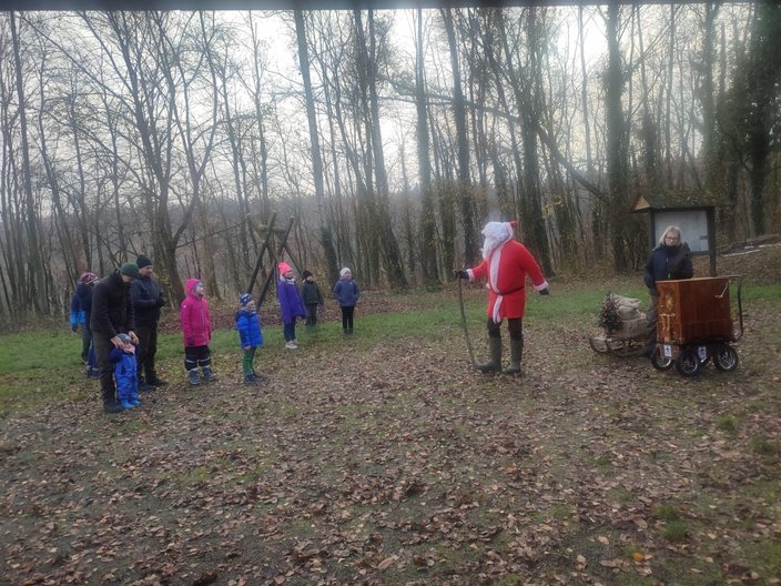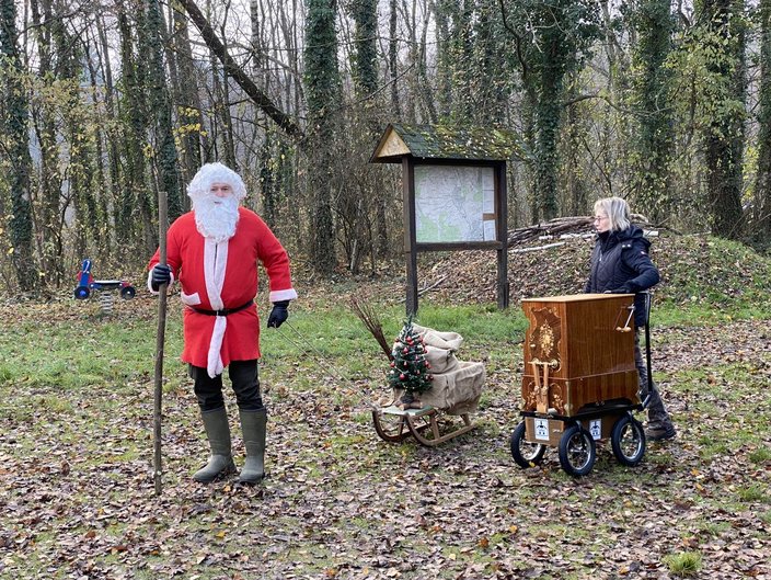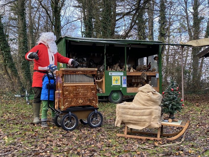 Als besondere Überraschung für die kleinen und großen Kinder kam dann zur Mittagszeit noch der Weihnachtsmann mit seinem Schlitten und einer Drehorgel vorbei. In seinem Sack hatte er für jedes Kinder ein kleines Geschenk versteckt.