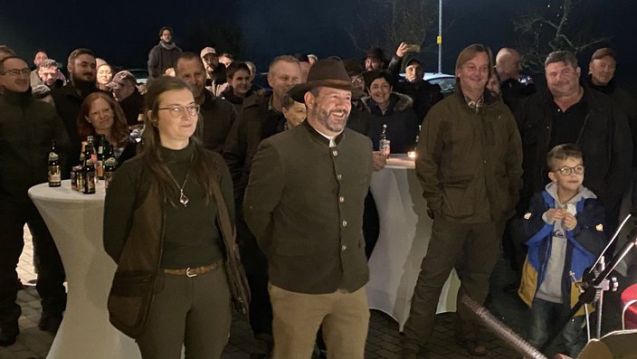 Ab circa 18 Uhr trafen die ersten Jungjäger mit ihren Begleitungen ein, um sich bei leckeren Bratwürsten und Getränken über ihre ersten Erfahrungen auf der Jagd auszutauschen. Gegen 19 Uhr wurde dann die Zeremonie mit der Begrüßung durch die Jagdhornbläser unserer Jägervereinigung eröffnet. An dieser Stelle ein herzliches Dankeschön und Waidmannsheil an die Bläser unter der Leitung von Manfred Heilig. Anschließend kam es zum Jägerschlag mit den traditionellen Worten: