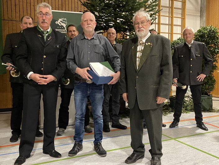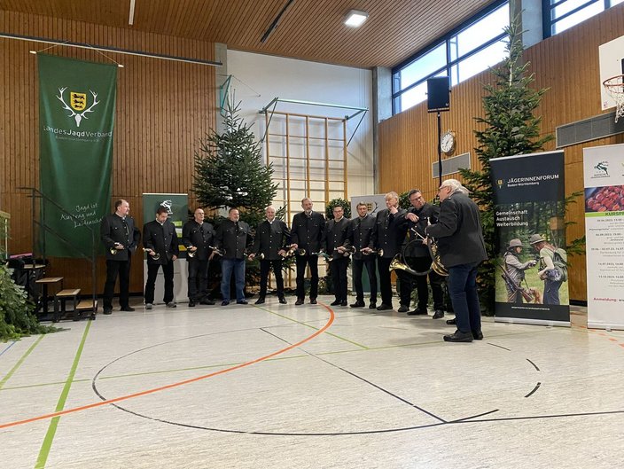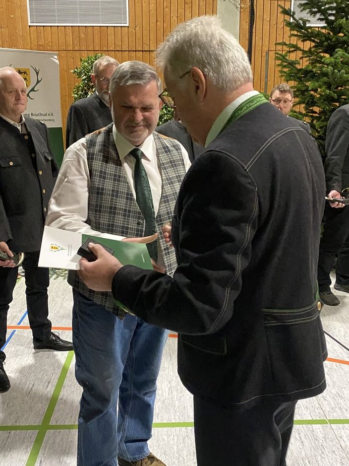 Neben den geladenen Gästen fanden sich auch 178 Jägerinnen und Jäger in der Halle ein. Die Eröffnung der Veranstaltung machte unsere Jagdhornbläser und anschließend Kreisjägermeister Werner Ritter. Mit Grußworten des Bürgermeisters ging es dann in den ersten Teil des Abends über. Dr. Joachim Thierer und Wildtierbeauftragter des Landkreises starteten mit einem Vortrag zu aktuellen Themen des Landkreises. Dr. Thierer stellte die ASP vor und zeigte die aktuelle Entwicklung auf. Zum aktuellen Zeitpunkt haben wir in Deutschland schon 447 bestätigte Fälle. Bei diesen Zahlen ist es nur eine Frage der Zeit, bis es auch bei uns einen Ausbruch gibt. Daher die Bitte an alle Jägerinnen und Jäger, die Möglichkeit wahrzunehmen und Blutproben beim Veterinäramt abzugeben. Dazu stehen an den Sammelstellen Sets bereit. Als kleiner Anreiz gibt es sogar 50 € pro Beprobung. Herr Reinhard referierte über das Thema Schwarzwildstrecke. Wie viele von uns sicherlich bemerkten ist die Strecke dieses Jahr deutlich eingebrochen, was auch die Zahlen der Trichinproben belegten. Hatten wir im Jagdjahr 2021/22 noch eine Strecke von über 5000 Stück, ist sie dieses Jahr auf 2500 eingebrochen. Das kann als Erfolg im Sinne der Seuchenprävention gewertet werden. Ein weiteres aktuelles Thema im Landkreis ist der Wolf. Fast täglich ist das Landratsamt hiermit konfrontiert. Erfreulich war, dass mittlerweile 191/194 Revieren im Landkreis im Wildtierportal aktiv sind und somit der gesetzlichen Bestimmung der digitalen Streckenmeldung nachkommen. Letztes Thema war der Stadtjäger, welcher Stück für Stück im Landkreis etabliert werden soll. Aktuell gibt es leider erst 10 anerkannte (4 davon in unserer Jägervereinigung), aber noch keine eingesetzten Stadtjäger im Land.