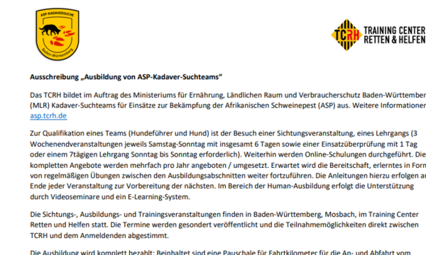 Das TCH bildet im Auftrag des Ministeriums für Ernährung, Ländlichen Raum und Verbraucherschutz Baden-Württemberg (MLR) Kadaver-Suchteams für Einsätze…